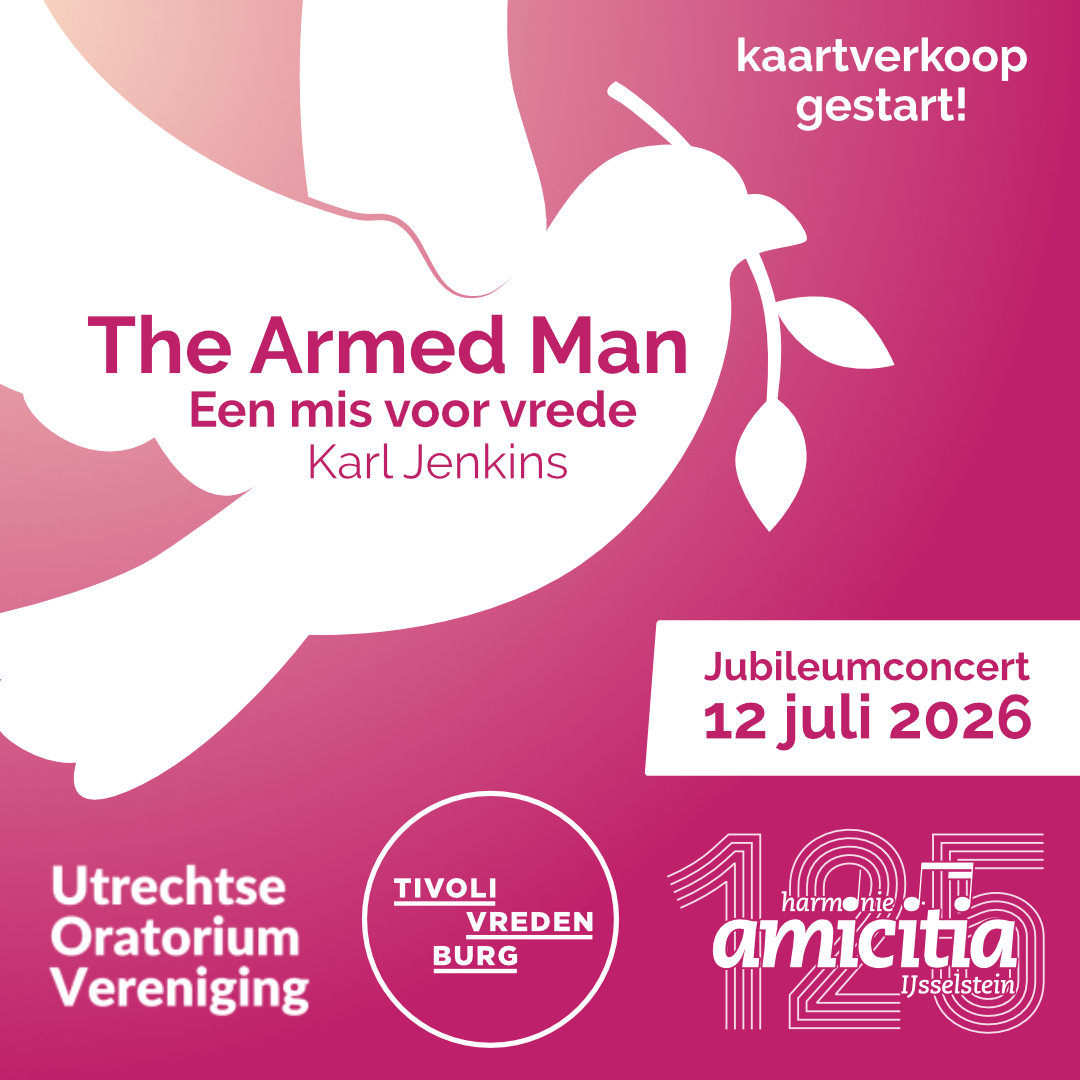 verjaardag op het mooie podium van TivoliVredenburg in Utrecht. De droomlocatie voor elke muzikant! Voor deze feestelijke gelegenheid bundelen wij onze krachten met de Utrechtse Oratorium Vereniging voor een uitvoering van The Armed Man – Een mis voor vrede van Karl Jenkins.