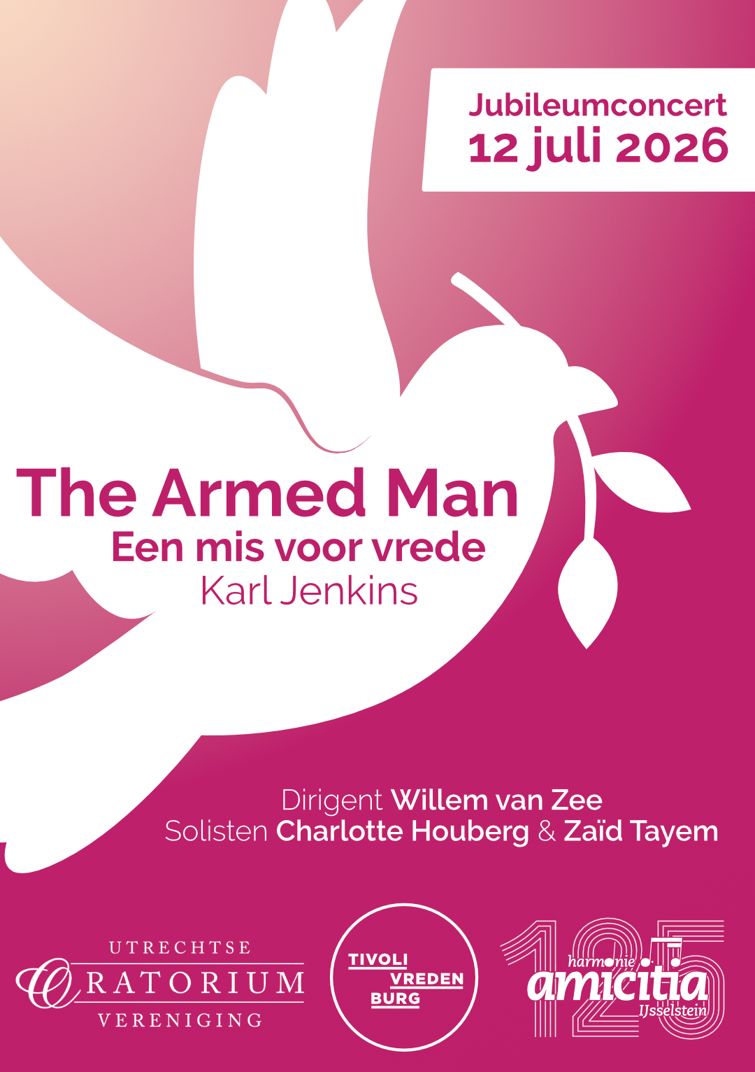verjaardag op het mooie podium van TivoliVredenburg in Utrecht. De droomlocatie voor elke muzikant! Voor deze feestelijke gelegenheid bundelen wij onze krachten met de Utrechtse Oratorium Vereniging voor een uitvoering van The Armed Man – Een mis voor vrede van Karl Jenkins. Dit wereldberoemde werk raakt miljoenen mensen door de krachtige boodschap van hoop, menselijkheid en verlangen naar vrede. Juist in een tijd waarin conflicten en oorlogen dagelijks het nieuws beheersen, klinkt deze oproep harder en dringender dan ooit. Je kunt een middag verwachten vol indrukwekkende muziek, rijke orkestrale kleuren en monumentale koorzang. Van verstilde momenten die je adem laten stokken tot mee slepende passages die je recht in het hart raken; dit concert wordt een muzikale ervaring die je niet snel zult vergeten. Het orkest staat onder leiding van dirigent Willem van Zee. Solisten zijn sopraan Charlotte Houberg en Zaïd Tayem; die als muezzin een oproep doet tot gebed. Meer informatie op: www.harmonieamicitia.nl